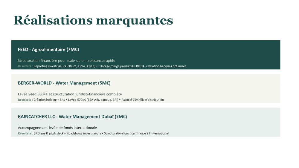 - Accompagnement pour votre levée de fonds et construction de votre financement (dilutif, non dilutif, ...). Amélioration des présentations de projets d'entreprises dans l'optique d'une levée de fonds. Conseil aux jeunes PME - et start-up dans l'élaboration de leur business plan, leur "pitch" (ou présentation efficace aux investisseurs et banquiers) et sélection de leurs investisseurs potentiels.